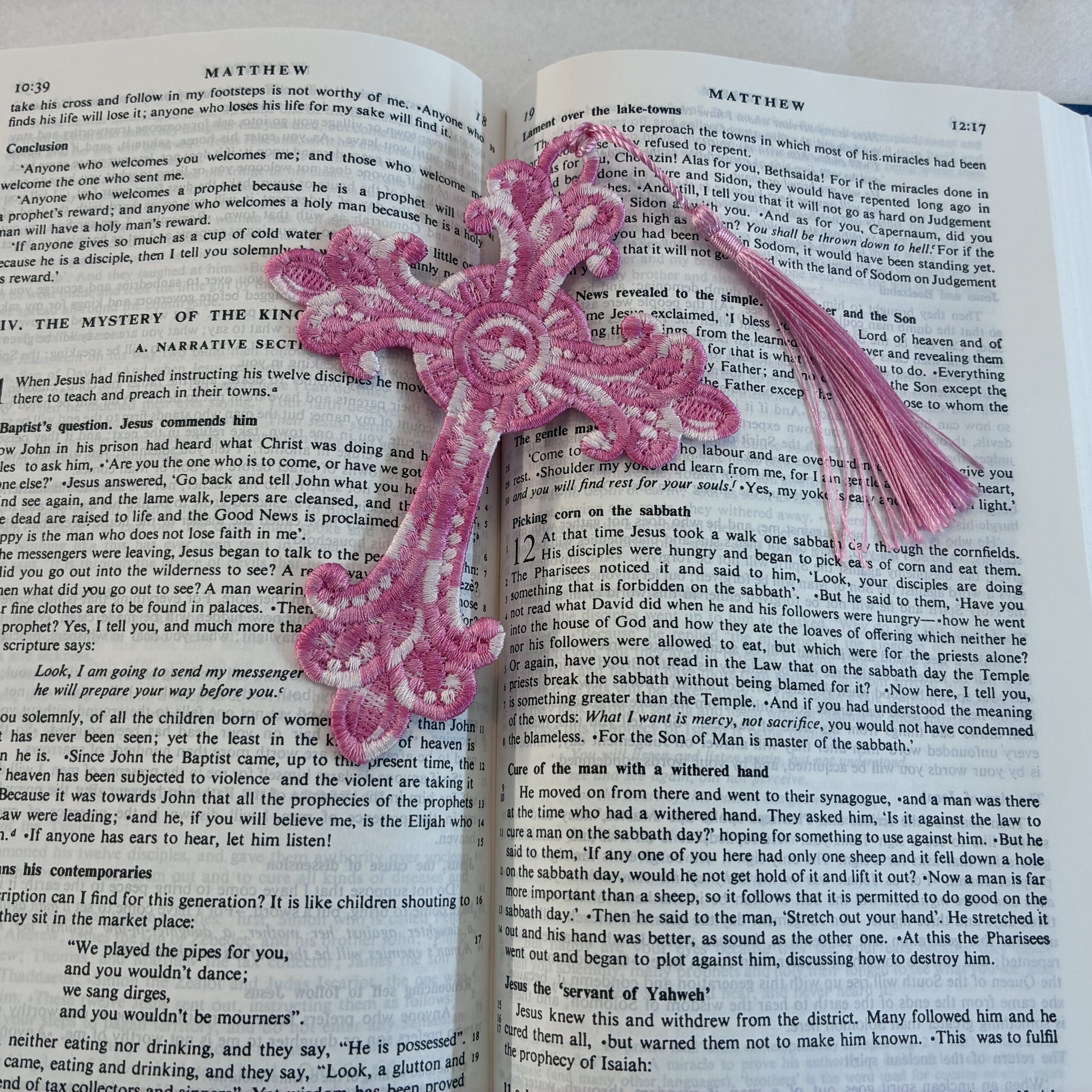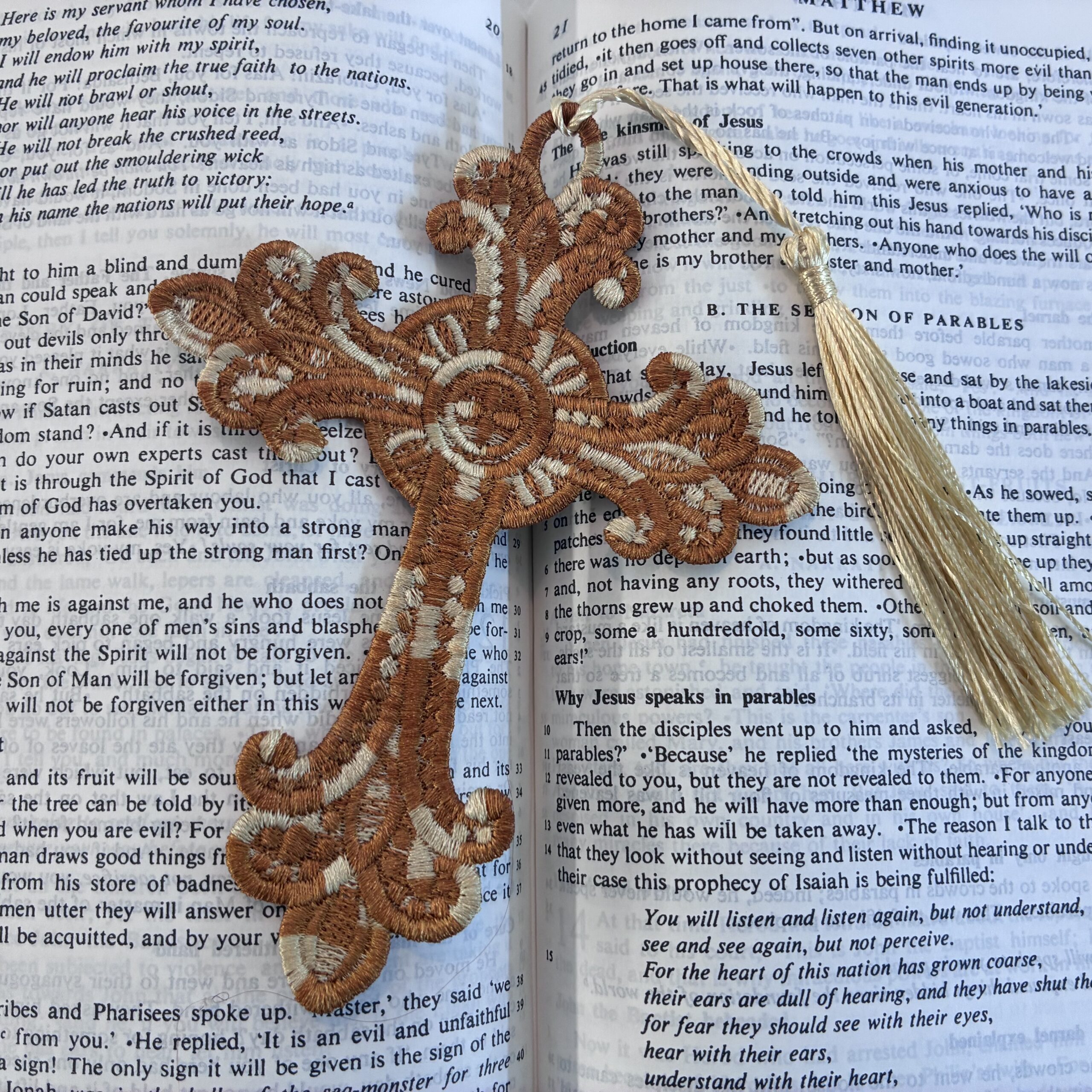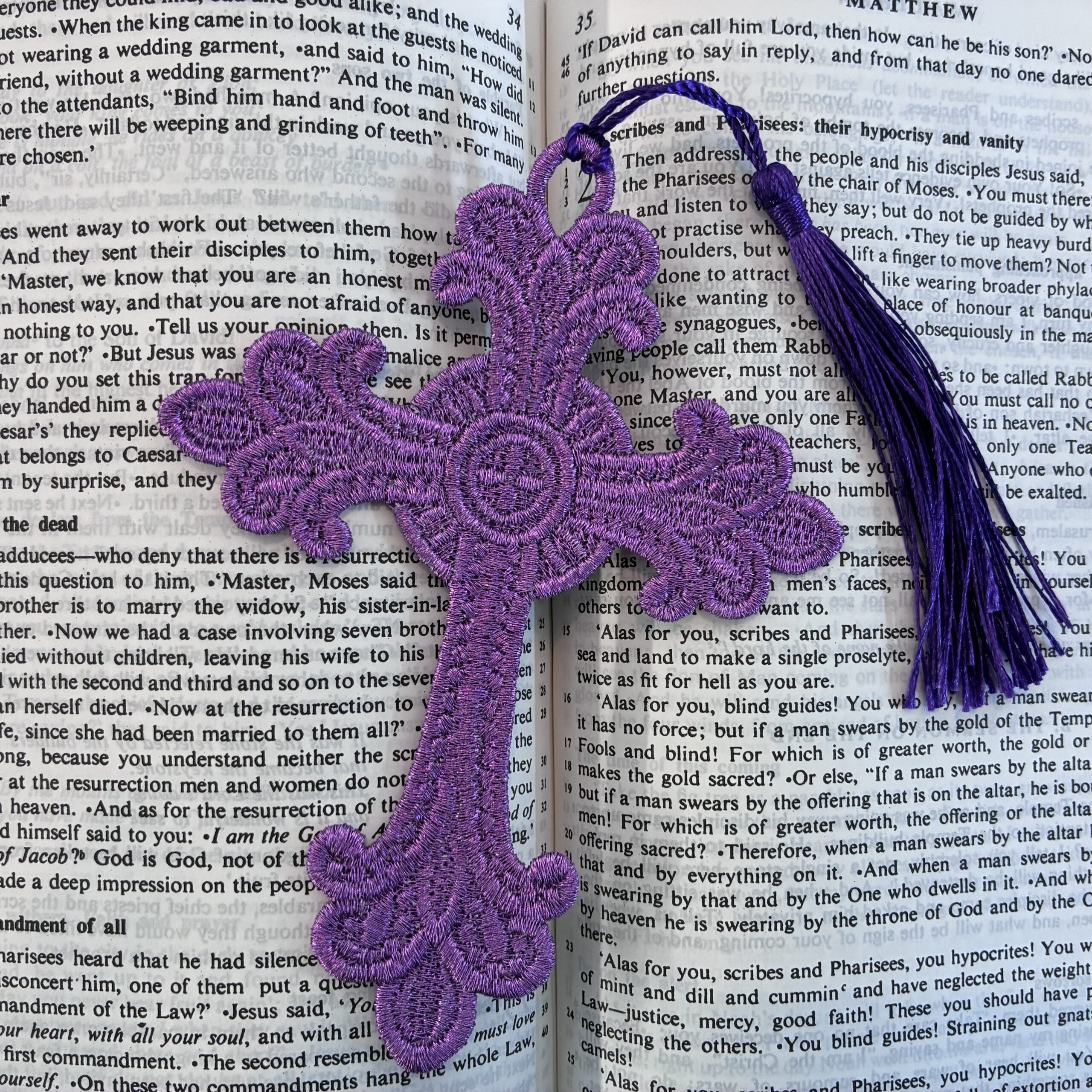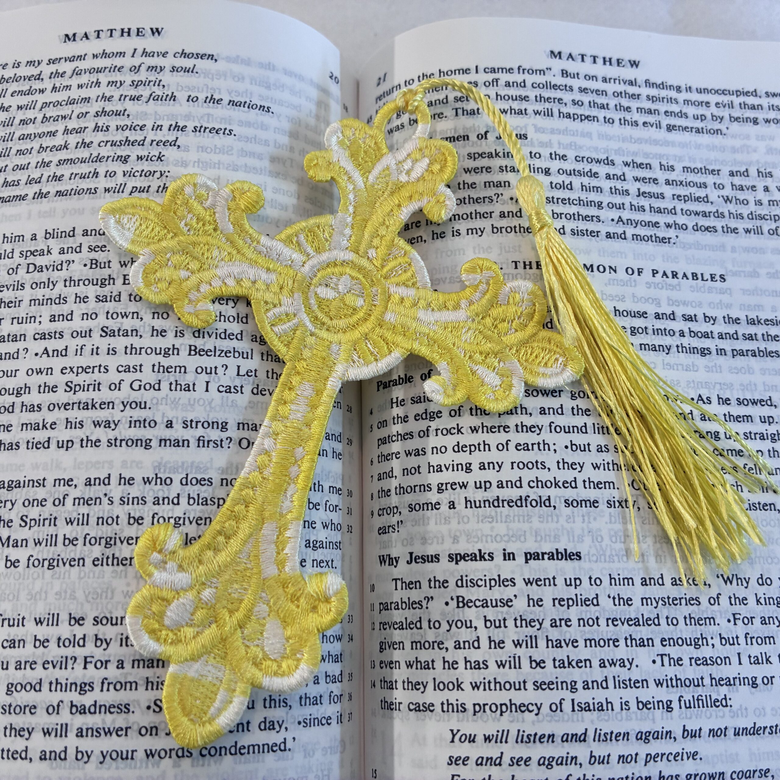 A range of embroidered, lace bookmarks, available in a variety of colours and sizes. These are produced in the UK, with over one hour of production going into each. They are not embroidered on cloth, but the entirety of the bookmark is made from stitches. An ideal companion for Bibles, Missals and Prayer Books, or for a beautiful gift!