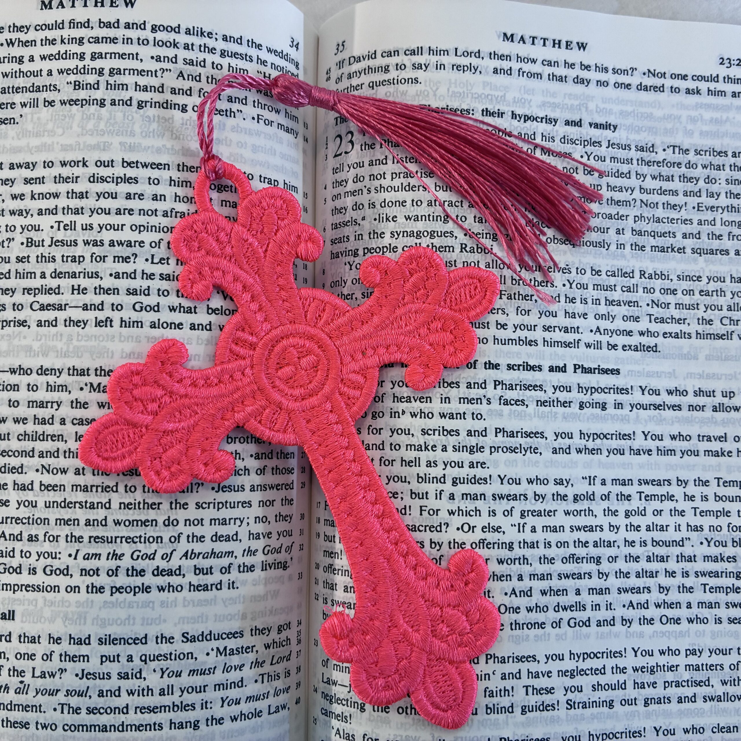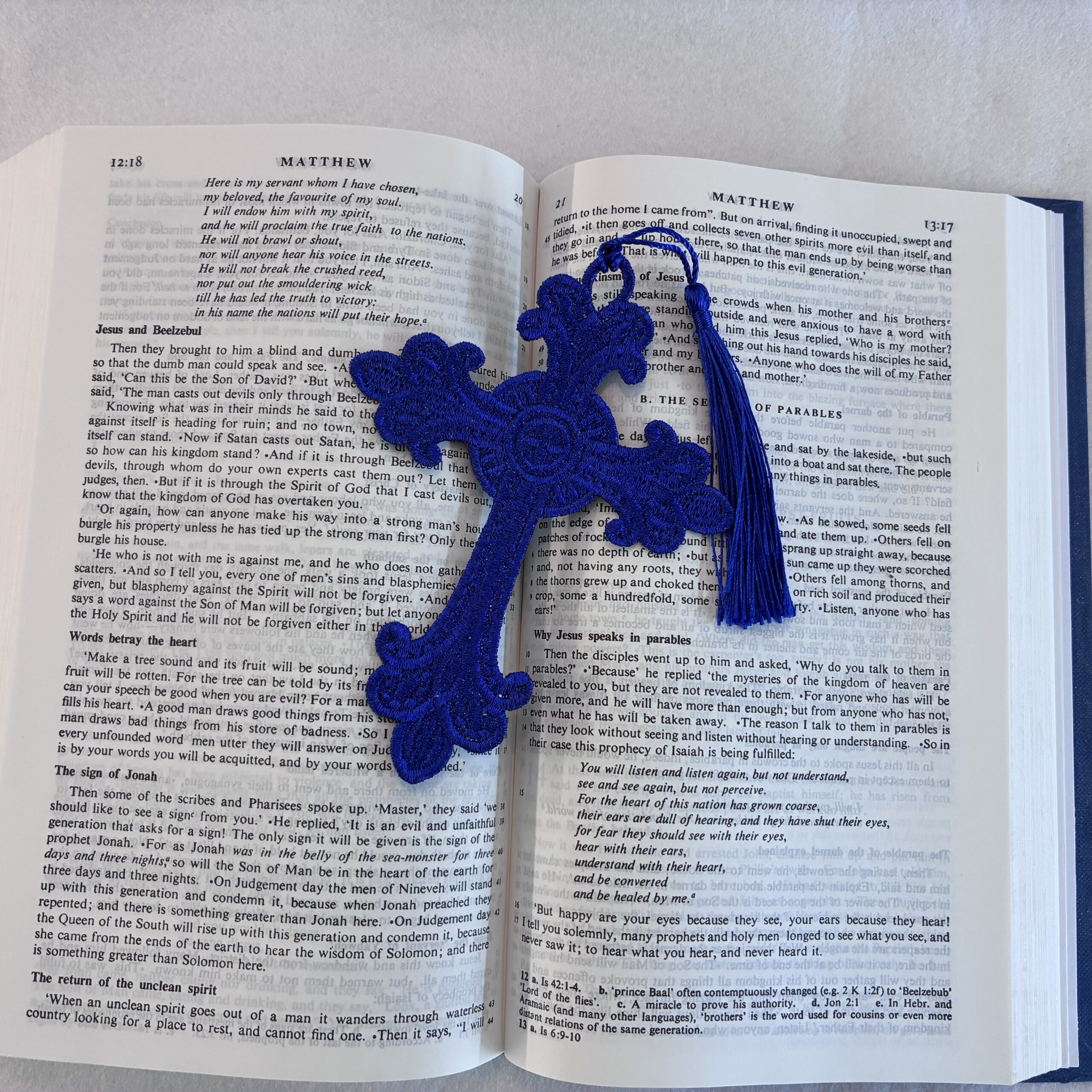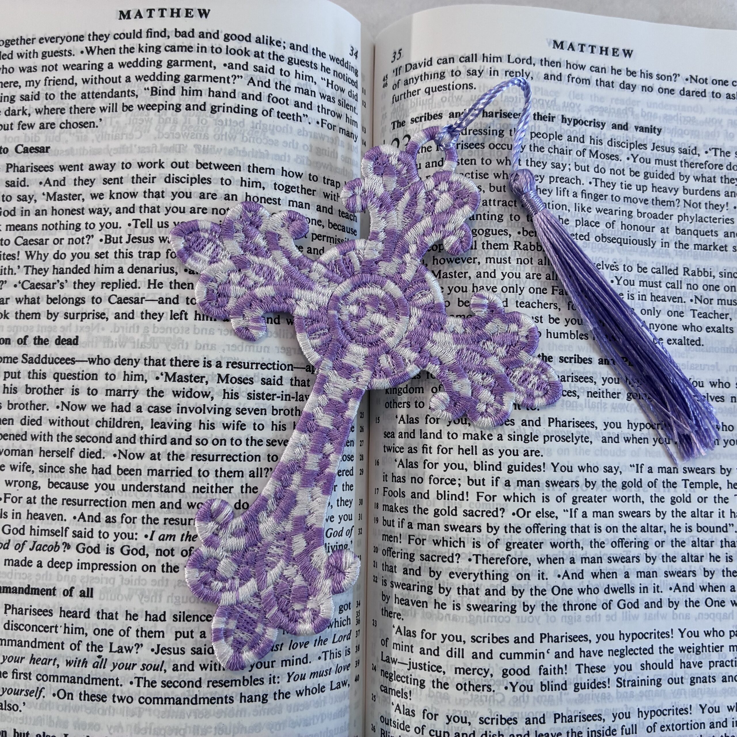 A range of embroidered, lace bookmarks, available in a variety of colours and sizes. These are produced in the UK, with over one hour of production going into each. They are not embroidered on cloth, but the entirety of the bookmark is made from stitches. An ideal companion for Bibles, Missals and Prayer Books, or for a beautiful gift!
