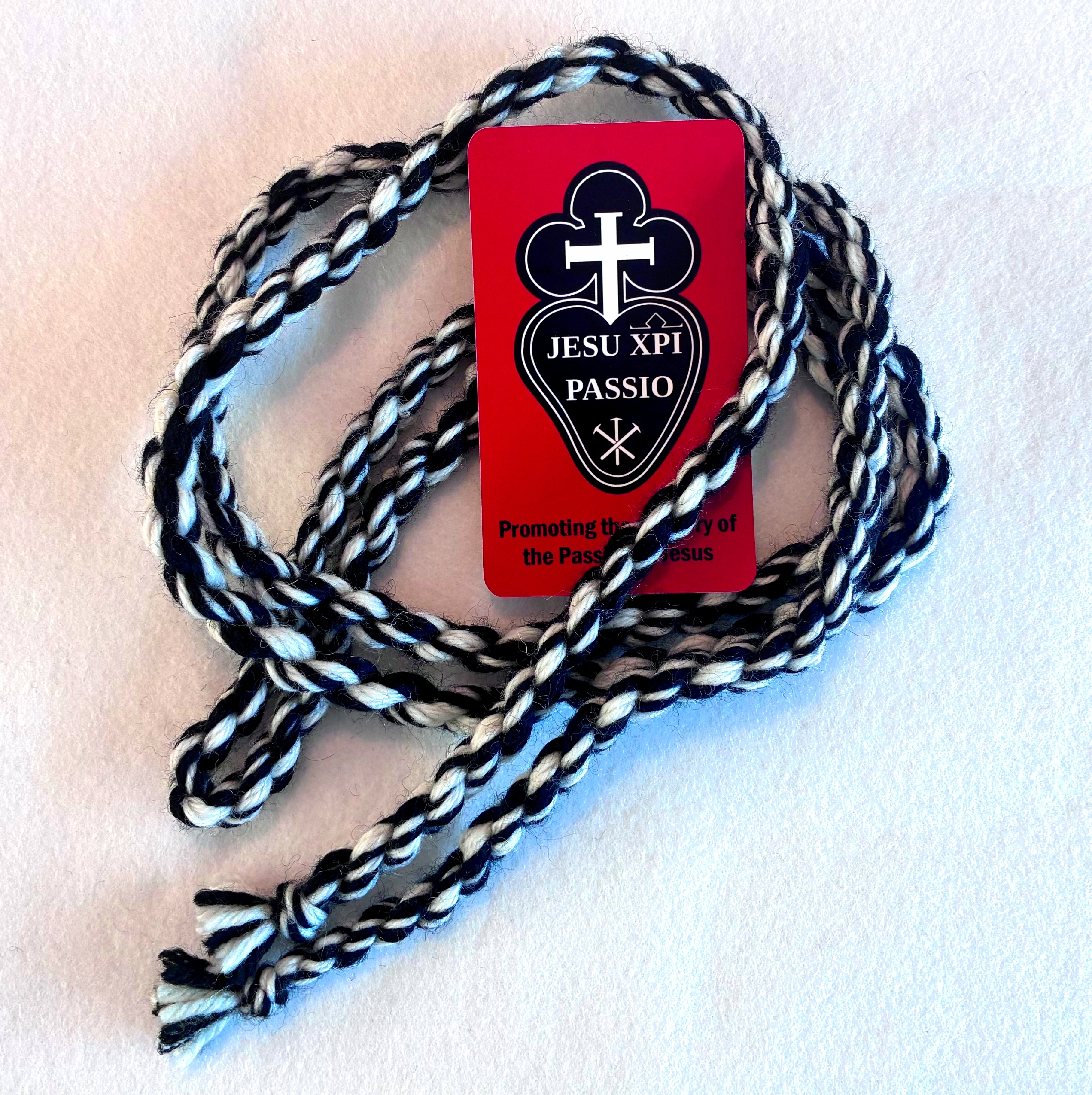 A substantial Cord Belt representing the Passionist Order, made from 100% pure white and black wool, representing the colours of the Passionist Order crest. For lay people who wish to wear a representation in honour of the Passionist Order.