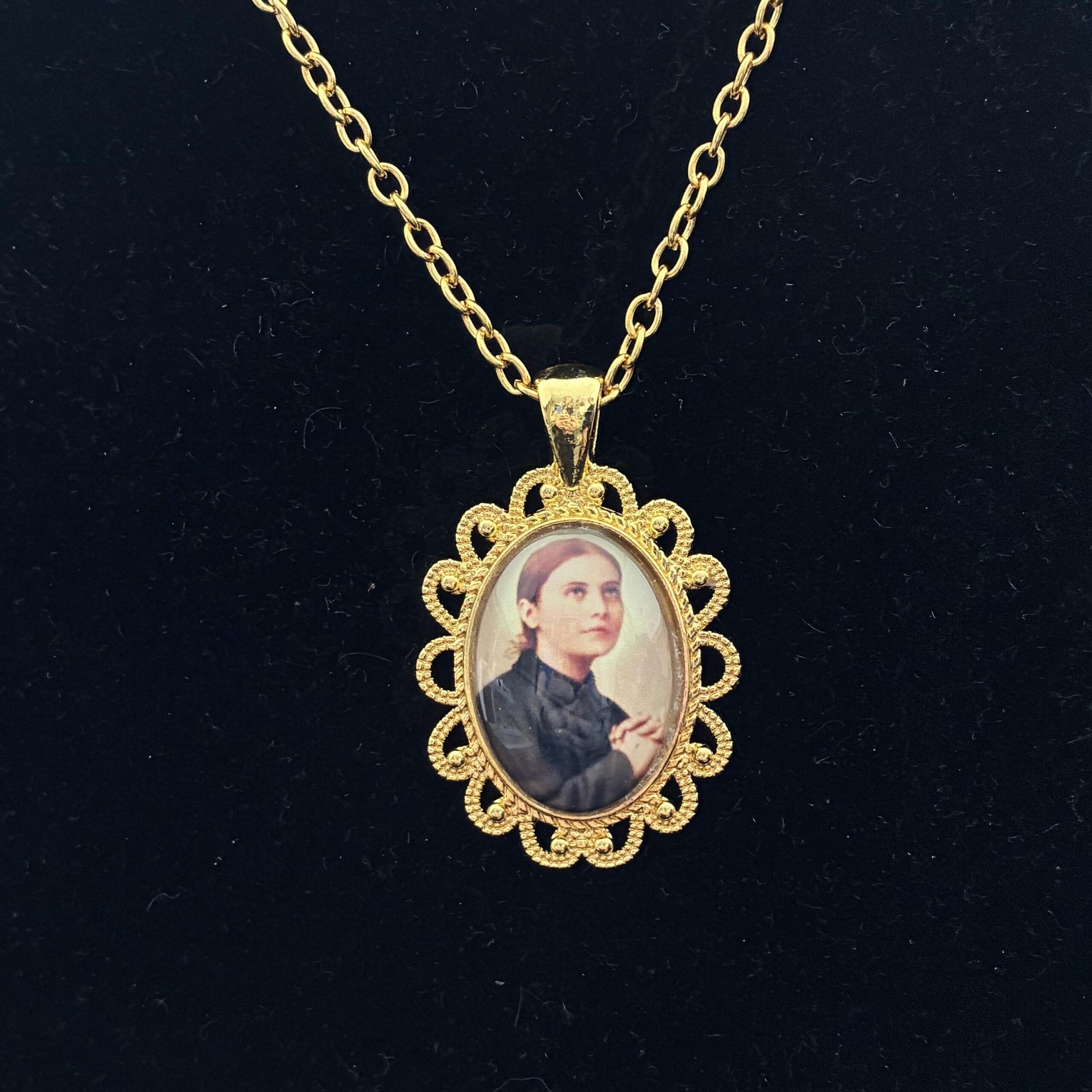 An elegant gold-finish necklace, featuring a glass-covered photo of St. Gemma Galgani. The setting is approx. 30mm x 25mm. The chain may be easily unfastened with the clasp. Please select the required chain-length from the pull-down menu.